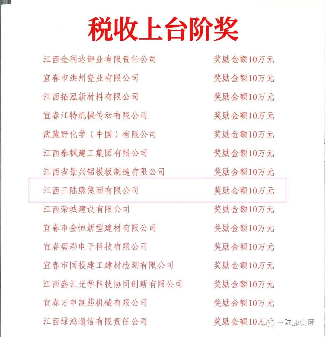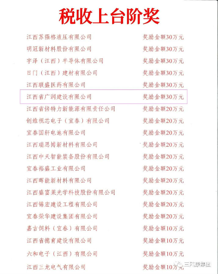 江西三陸康集團(tuán)和江西省廣潤(rùn)建設(shè)有限公司因多年來一直堅(jiān)持依法經(jīng)營(yíng)、誠信納稅,積極履行社會(huì)責(zé)任,在表彰大會(huì)中榮獲稅收上臺(tái)階獎(jiǎng),分別獲得十萬元、三十萬元獎(jiǎng)金。